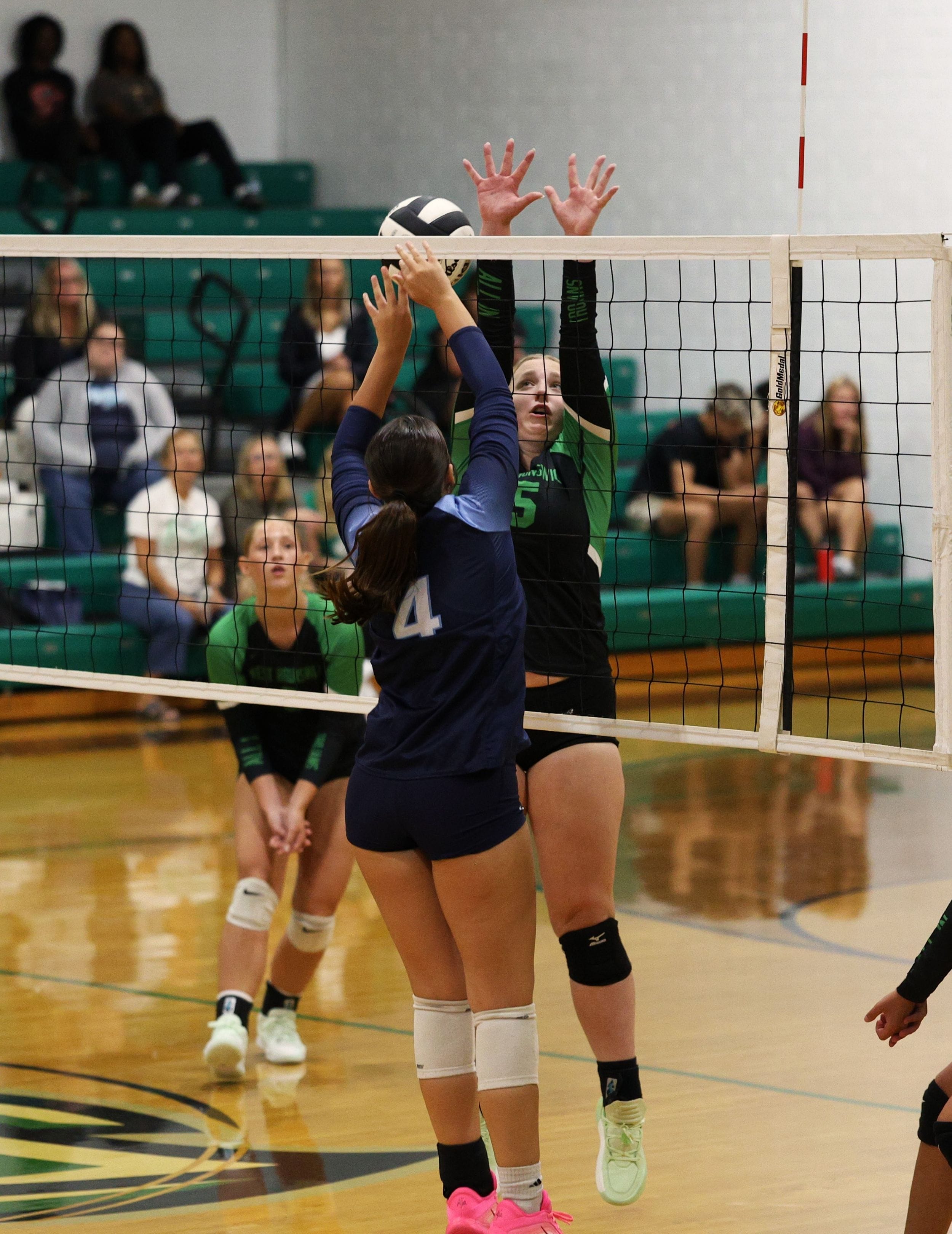 South Brunswick’ senior Kaydence Watkins (4) contends with Wesr senior Kelsey Lykins at the net during Tuesday’s match.(Shallotte Area Sports Photo/W.A. Myatt)